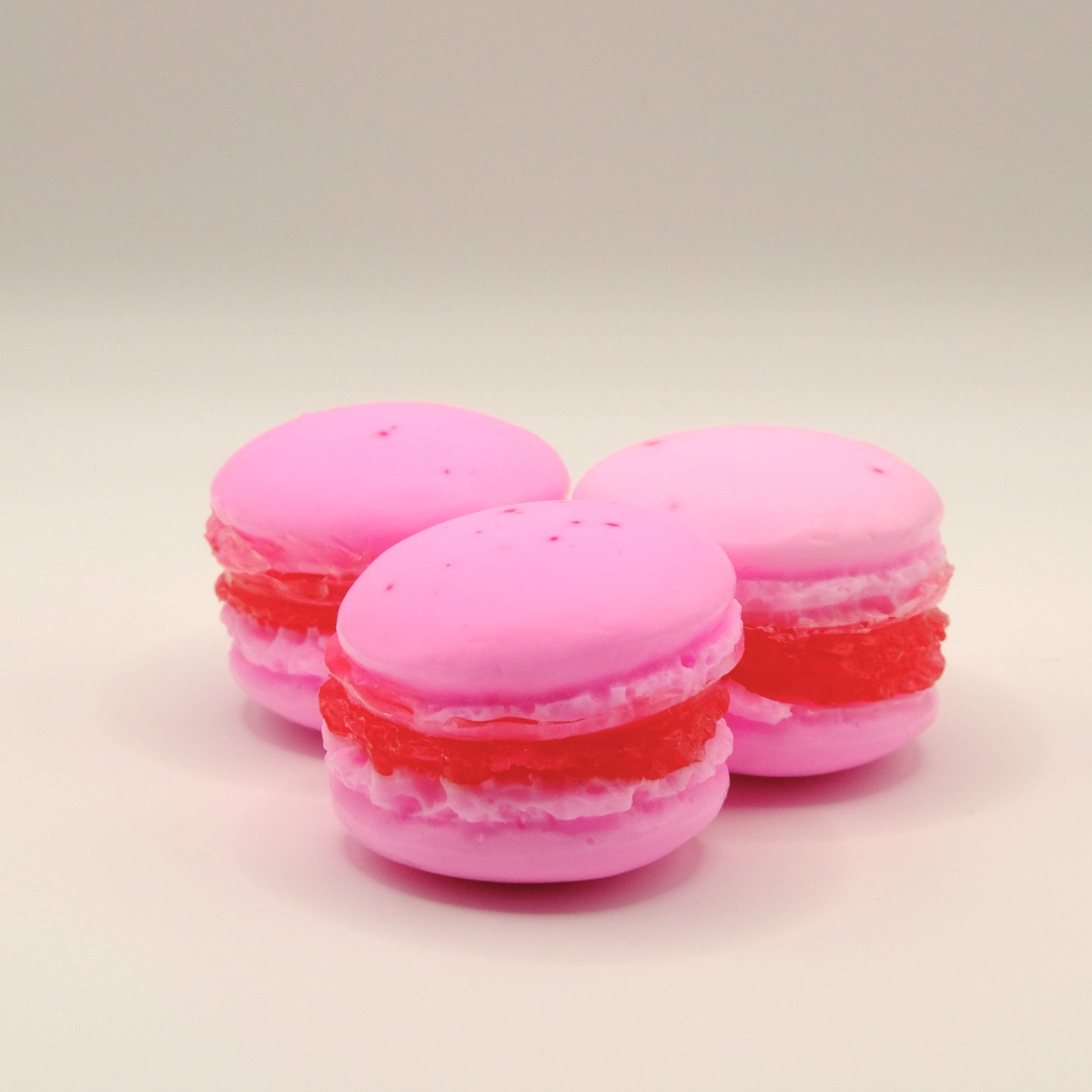 Sweet strawberry scented soap in the shape of a mini macaron! Sweet and tart, smells like a fresh and ripe strawberry.